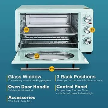 Show moreStep back in time with the Elite Gourmet Americana Vintage 50’s Diner Retro Countertop Toaster Oven. Combining classic diner aesthetics with contemporary functionality, this stylish toaster oven is available in a charming mint color that adds a splash of fun and nostalgia to any kitchen setting. Its vibrant design is complemented by modern technology, making it a must-have for those who appreciate both beauty and performance in their culinary toolkit. Whether you're creating a quick breakfast or a full meal, this toaster oven is equipped to handle all your cooking needs.