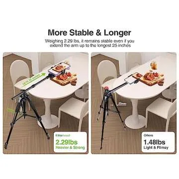 Show moreExperience professional-quality video recording like never before with the Elitehood Ultra-Stable Overhead Tripod for your iPhone. Crafted from heavy-duty aluminum, this tripod not only promises a sturdy and stable base but does so while remaining lightweight at just 2.2 lbs. Its ingenious design supports even the bulkiest smartphones, ensuring a seamless recording experience across various settings. With a remarkable adjustable arm that extends up to 25 inches, you can effortlessly discover those unique angles or capture stunning overhead shots, making it the must-have tool for chefs, creators, and artists alike.