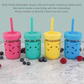 Elk and Friends Kids Cups/Toddler cups with Silicone Straws – Glass Mason Jars 8 oz with Silicone Sleeves + Straws + Straw Lids + Leakproof Lids – Spill Proof cups for Kids, Sippy Cups for Toddlers