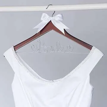 Show moreIntroducing the Ella Celebration Bride to Be Wedding Dress Hanger, an exquisite combination of functionality and elegance crafted entirely to enhance your special day. Made with premium mahogany wood, this hanger ensures your beautiful gown stays wrinkle-free while showcasing your dress in style. The thoughtful design includes notches that securely hold strapless dresses and those adorned with sleeves, making it ideal for any gown. The hanger’s unique silver wire artistry, elegantly shaped into the word "Bride" flanked by charming hearts, adds a personal touch that transforms even the simplest dress into a stunning focal point during your wedding day photos. Ensure your wedding memory is as immaculate as your dress with this exceptional accessory.
