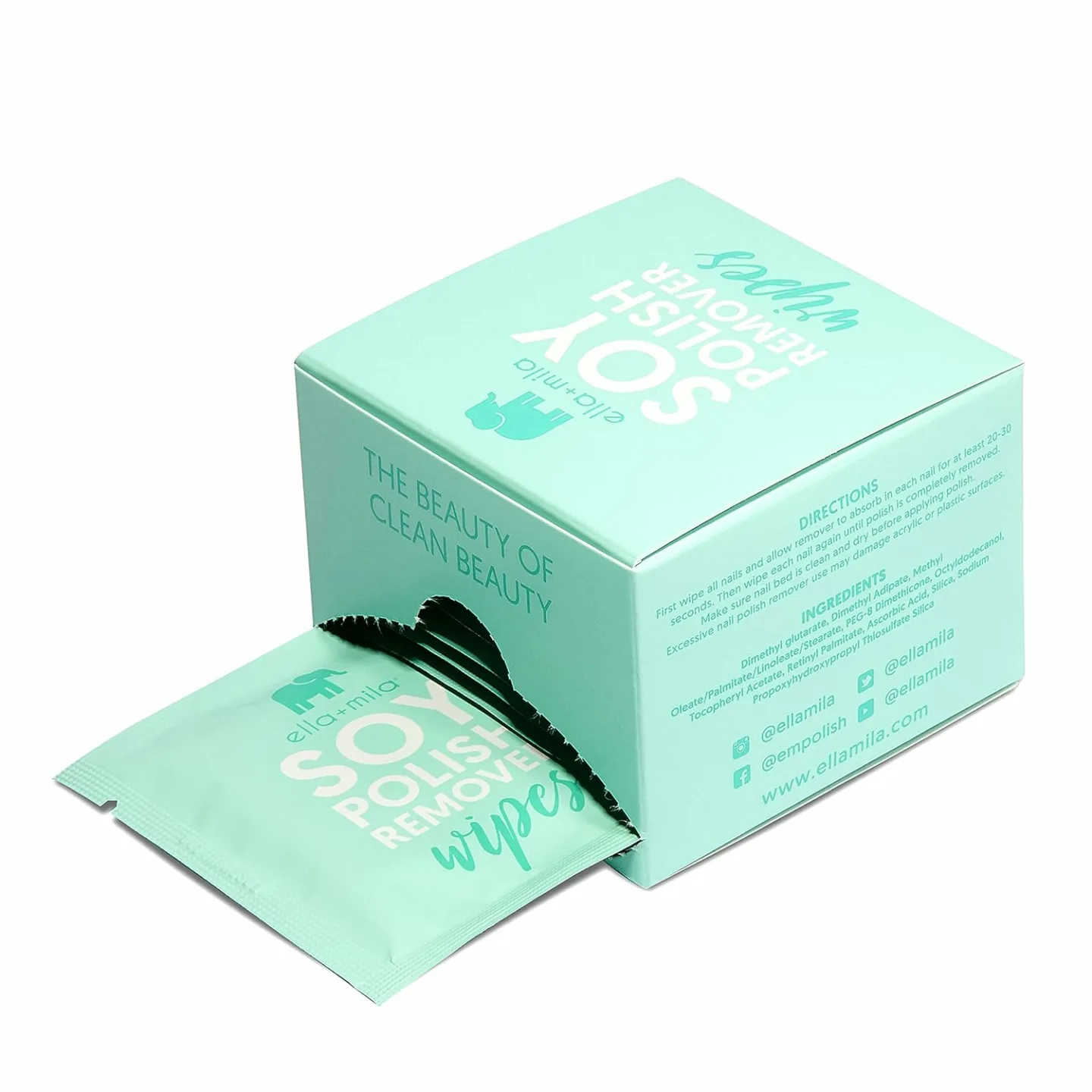 Ella+Mila Soy Nail Polish Remover Wipes are non-toxic and non-acetone, enriched with Vitamins A, C, and E to promote nail health. The unscented, lint-free wipes are individually packaged for convenience, ensuring no mess or spills during use. Unlike traditional removers, these wipes work effectively on even glitter polishes and leave no residue. Their unscented nature also makes them suitable for those sensitive to strong smells.