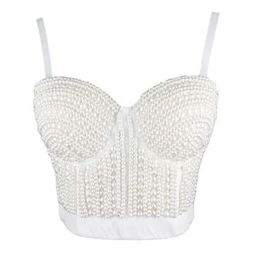 ELLACCI Woment's Pearls Beaded Bustier Crop Top Club Party Sexy Corset Top Bra White Large