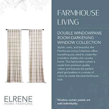 Show more Elevate your home decor with the ELRENE HOME FASHIONS Farmhouse Living Double Windowpane Plaid Room-Darkening Window Curtain Panel. Measuring 52 inches by 95 inches, this stylish and functional curtain panel integrates trendy plaid patterns against a crisp white backdrop, bringing a touch of rustic charm to any room. Whether you're looking to enhance the cozy ambiance of your bedroom or the inviting atmosphere of your living room, this blackout curtain is designed to meet your decorative aspirations without compromising on practicality.