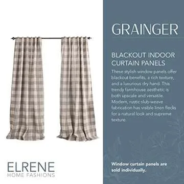 Show moreEnhance your home with the elegant Elrene Home Fashions Farmhouse Living Grainger Buffalo-Check Blackout Window Curtain. This 52" x 84" single panel drape is a delightful blend of rustic style and functional design, perfect for your living room or bedroom. Crafted from a high-quality fabric blend comprising 80% polyester and 20% linen, this curtain is not only durable but also brings a warm farmhouse charm to your decor.