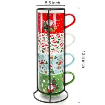Show more Introducing the Elsjoy Set of 4 Christmas Stackable Coffee Mugs, designed to bring warmth and cheer to your holiday gatherings. Crafted from sturdy ceramic, these mugs are not only visually appealing with their enchanting holiday designs that include Santa Claus, snowmen, reindeer, and Christmas trees, but they are also built to last. Each mug holds a generous 15 ounces, making them perfect for your favorite winter brews, whether it’s hot cocoa, latte, or a robust Americano. The accompanying matte black metal stand is a stylish addition to your kitchen that keeps your mugs organized while enhancing your festive décor. This set is a wonderful way to celebrate the season and make every sip a delightful experience while ensuring your beverages stay hot and flavorful.