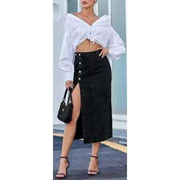 Show moreIntroducing the ELSTAROA Women's Casual High Waisted Solid Button Up Denim Jean Skirt in chic black, a perfect blend of style and comfort. Crafted from a high-quality fabric composition of 85% cotton and 15% polyester, this skirt ensures a breathable and comfortable wear experience throughout the day. With its high-waisted design, it accentuates your curves elegantly while providing ample coverage. Featuring a stylish button-up closure, this long/full-length skirt offers versatility, allowing you to dress it up or down for any occasion. Wear it with your favorite top and heels for a sophisticated look or pair it with a simple tee for a casual outing. The possibilities are endless! Less