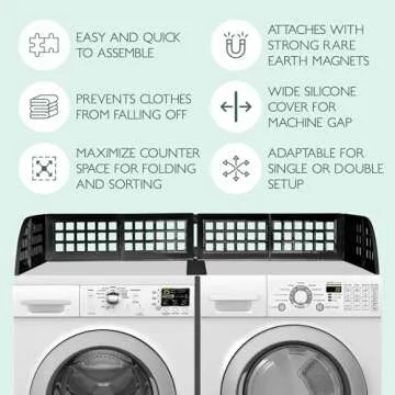 Show more Transform your laundry experience with the ELTOW Laundry Guard. Designed specifically for both single and double washer/dryer setups, this innovative product features a powerful magnetic fence that prevents clothes from falling behind your machines, ensuring no more lost socks or shirts. Crafted from durable materials, the ELTOW Laundry Guard is equipped with 8 extra strong neodymium N52 rare earth magnets, which provide a reliable and firm hold on flat and magnetic surfaces only. This means you can enjoy a more organized and efficient laundry room without the hassle of clothes slipping into those frustrating gaps.