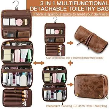 Show moreIntroducing the Elviros Hanging Toiletry Bag, an innovative travel companion designed to enhance your on-the-go experience while organizing your cosmetics, toiletries, and grooming essentials effortlessly. Crafted from premium PU leather, the bag boasts a sleek dark brown finish that not only looks stylish but also is durable and easy to clean. With its unique 3-in-1 detachable portability design, this toiletry bag allows you the flexibility to carry your essentials in three different configurations: utilize the entire bag for its spacious capacity, combine the top and bottom sections for a compact makeup kit, or use the middle as an independent bag. No matter your travel style, the Elviros bag adapts to meet your needs.
