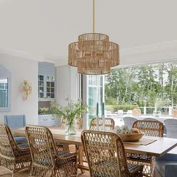 Show more Transform your living space into a haven of elegance and charm with the stunning ELYCCUPA 24” Boho Hand Woven Rattan Chandelier. This exquisite handmade twine wicker pendant light not only brightens up a room but also serves as a striking piece of art that showcases your wonderful aesthetic and taste. The vintage-inspired design, adorned with brass accents, brings a sense of creativity and warmth to any setting. Perfect for achieving a bohemian yet sophisticated look, this chandelier redefines your interior decor.