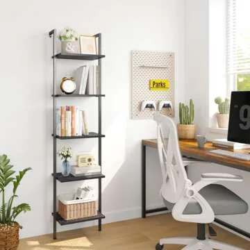ELYKEN Ladder Shelf, 5-Tier Wood Wall Mounted Bookshelf with Metal Frame, Vintage Open Display Organizer Rack, Leaning Storage Shelves for Living Room, Bedroom, Home Office, Black