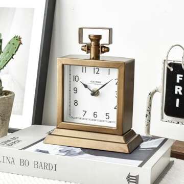 EMAX HOME Metal Table Clock, Decorative Mantel Desk Shelf Clock with Antique Gold Finish, Gold Small Mantel Clock with Silent Quartz Movement