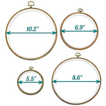 Show moreDiscover the exquisite Embroidery Hoop Frames by Celley, a beautifully curated set of 4 vintage imitated wood design hoops that are perfect for showcasing your embroidery and cross-stitch projects. Available in four distinct sizes ranging from 5.5" to 10.2" in outer diameter, these hoops effortlessly blend functionality with aesthetic charm. The hoops are designed to look like authentic wood, giving your handiwork a rustic and sophisticated feel without the need for professional framing. Enhance your craft experience and bring your art to life with these elegant frames that are as delightful to use as they are to display, making any wall a focal point of creativity.