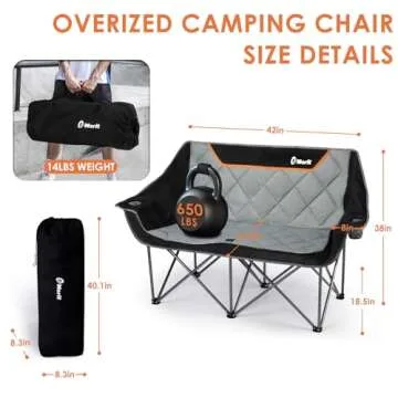 Show moreExperience the great outdoors like never before with the EMERIT Oversized Double Duo Camping Chair. This innovative heavy-duty lawn chair is engineered to comfortably support up to 650 lbs, making it the perfect seating solution for couples and families who love to unwind together in nature. Measuring a generous 57.5 inches wide, this camping loveseat provides ample space for you and your loved ones to relax without feeling cramped. The chair's elevated 38-inch height from the ground, paired with a practical seat height of 18.5 inches, ensures an effortless sitting and standing experience, a blessing for those who may struggle with lower seating arrangements.