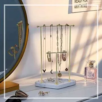 Show moreIntroducing the Emibele Jewelry Stand Organizer, your ultimate solution for keeping your precious accessories neatly arranged and easily accessible. This exquisite 2-tier jewelry holder blends sophistication and functionality, designed with a striking gold metal rack and an elegant marble pattern tray. Its versatile elements make it a perfect fit for any home decor, whether placed on a vanity countertop, bedside table, or bathroom sink. With its sleek yet bold design, this jewelry organizer doesn't just store jewelry but enhances any space it occupies!
