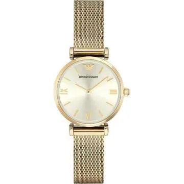 Show moreThe Emporio Armani Women's AR1957 Retro Gold Watch is a timeless piece that blends elegance and functionality seamlessly. This gold-tone bracelet watch features a polished bezel with a tonal dial, baton and Roman numeral indices, and the iconic Emporio Armani logo at the 12 o'clock position. The watch’s 32 mm stainless steel case is complemented by a mineral dial window, ensuring durability while maintaining a sophisticated look. With its reliable quartz movement and analog display, this timepiece reflects precise craftsmanship and classic design, making it an essential accessory for any stylish woman.