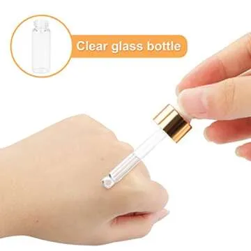 Show more Discover the elegance and functionality of our Empty Transparent Glass Bottles, the ideal solution for storing your essential oils, perfumes, and DIY creations. Designed with a refined aesthetic, each bottle has a capacity of 5ML, making them perfect for sample sizes or travel. Crafted from high-quality transparent glass, these vials feature a white rubber top and a luxurious gold head glass dropper that elevates your experience. Compact and lightweight, each bottle measures just 16x45mm (0.63x1.77 inches), making them incredibly easy to carry and use wherever you go.