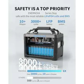 The ENERNOVA 600W is equipped with a durable LiFePO4 battery that not only lasts up to 10 years but also ensures you have a dependable energy source for all your devices. Say goodbye to frequent replacements; this battery can handle over 3,000 charge cycles effectively. The standout feature is its high-capacity output of 600W pure sine wave AC, capable of supporting multiple devices simultaneously.