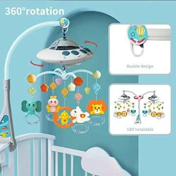 - 360° Rotating Design: The mobile features hanging rattles that rotate slowly while playing soothing music, captivating your baby's attention and helping them feel secure.