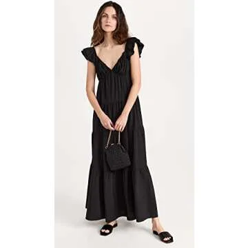 Show moreStep into summer with effortless elegance in the English Factory Women's Ruffle Sleeve Maxi Dress, a stunning blend of style and comfort crafted from high-quality, mid-weight low-stretch poplin fabric. Designed with a flattering V neckline and delicate flutter sleeves, this dress perfectly combines feminine charm with modern sensibility. Whether you're dressing it up for a evening out or keeping it casual for a daytime date, the tiered seams add a playful touch that's sure to make you the center of attention. Available in classic black, this maxi dress is a versatile staple that will elevate your wardrobe.