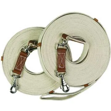 The loop at the handler's end ensures a secure grip, letting you feel confident during every interaction with your horse. This pair of Poly-Cotton Web long lines comes equipped with leather stops that provide additional control, making them an essential tool for any horse enthusiast. Whether you're an owner, trainer, or handler, these lines merge both form and function, making it a perfect addition to your equestrian gear.