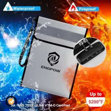 Show more Introducing the ENGPOW Fireproof Document Bag with Lock—your ultimate safeguarding solution for essential documents and valuables. Engineered with a revolutionary three-layered silicone-coated fiberglass, this bag can endure extreme temperatures of up to 5200℉. It provides an unyielding defense against fire-related disasters, ensuring that your irreplaceable documents and belongings remain protected even in the direst of situations. Additionally, the bag incorporates a layer of aluminum foil insulation, creating a fortress that keeps everything inside safe and intact.