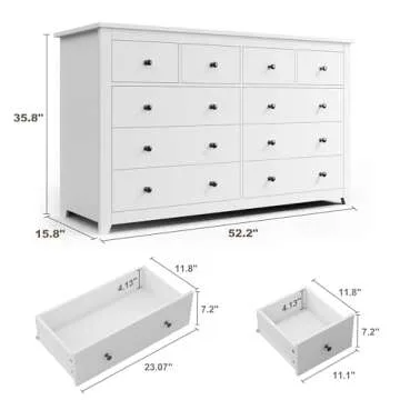 Show moreThe EnHomee 10 Drawer Dresser is the epitome of modern elegance and functionality. Designed with a stunning combination of white and black colors, this dresser adds a classic yet contemporary touch to any space. The metal circle handles on each drawer introduce a unique accent, enhancing the visual appeal of your bedroom, living room, or hallway. Whether you're looking to store clothing, accessories, or other personal items, this dresser is an absolute storage solution with 6 spacious drawers and 4 small drawers. The wide wooden top is perfect for displaying decorations, potted plants, or even as a TV stand, making your room look neater and more sophisticated.