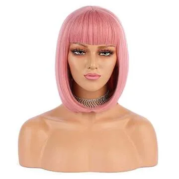 eNilecor Pink Wig, 12" Short Bob Wigs with Bangs Straight Synthetic Colorful Cosplay Daily Party Wig for Women Natural As Real Hair+ Free Wig Cap (Pink)