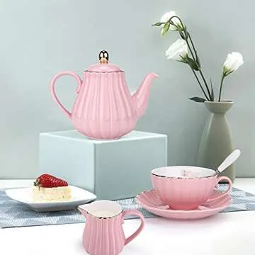 Show more Introducing a gorgeous 15-piece porcelain coffee and tea set that elevates every gathering with its exquisite British royal style. Each piece, crafted from high-quality, 100% safe material, is designed to maintain your beverage's warmth longer, ensuring every sip remains delightful. This splendid set features four tea cups, four saucers, four teaspoons, a teapot, a sugar bowl, a cream pitcher, and a stainless steel filter. Perfectly suited for a variety of occasions, it sets a charming tone for your home decor and adds a noble touch to any party.