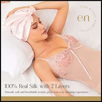 Show more Experience the ultimate in hair care with the ennva 22 Momme 100% Silk Sleep Cap, specially designed to keep your hair healthy, hydrated, and looking fantastic. Crafted from luxurious, pure mulberry silk, this two-layered bonnet ensures that you wake up free from frizz and breakage, making it the ideal solution for those bad hair days. Its snug yet comfortable fit accommodates all head sizes, making it perfect for individuals with all hair types, especially thick or curly hair.