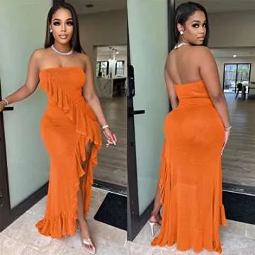 ENOPINK Women Off Shoulder Strapless Ruffle High Slit Bodycon Cocktail Party Dress Sheer Mesh Swimwear Cover Up Maxi Dress Orange XL