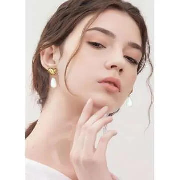 Show more Introducing the exquisite ENSKEFEN Gold Heart Pearl Earrings, a perfect blend of charm and sophistication. These stunning pearl drop earrings feature a beautiful gold heart design, elegantly complemented by delicate white pearls that exude timeless beauty. Whether you're dressing up for a special occasion or adding a touch of elegance to your daily attire, these earrings serve as a perfect statement piece or effortlessly pair with other accessories.