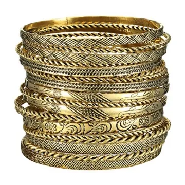 Show moreIntroducing the ENSOUL Antique Gold Color Flower Mixed Metal Aztec African Indian Vintage Multi Bangle & Bracelets Set, a stunning collection designed to express your individual flair. This exquisite set consists of 19 beautifully crafted bangles, all featuring intricate designs that seamlessly blend ethnic and contemporary styles. Each bangle showcases the rich heritage of cultural craftsmanship, making them perfect for both everyday wear and special occasions. With a perfect inner diameter of 2.68 inches, these bangles are versatile enough to match a variety of outfits, whether you’re going for boho chic or classy elegance.