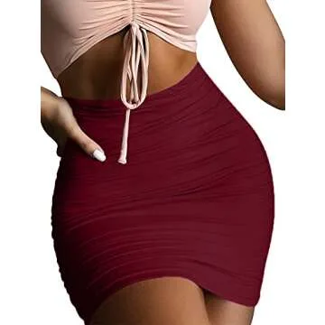 eoeoo Women's Stretch High Waist Ruched Bodycon Double Layer Casual Mini Skirt Wine Red Medium