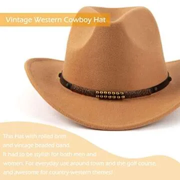 EOGIMI Western Cowboy Hats for Women Men Felt Wide Brim Panama Hat with Belt Buckle Bead Band-Camel