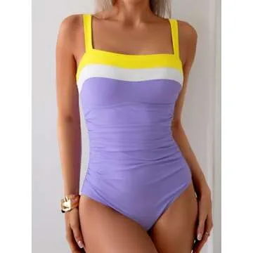 Show more Introducing the Eomenie Women's One Piece Swimsuit—the perfect combination of style, comfort, and function. Designed with a tummy control feature, this swimsuit boasts a unique ruched waist design that beautifully modifies your waistline, enhancing your curves and giving you a slimming effect. The attractive color block design sets this swimsuit apart, making you stand out confidently by the pool or at the beach.