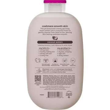 This body wash is carefully crafted to be entire bikini area approved, providing a gentle cleanse while being formulated to match your skin's pH, thereby maintaining a healthy skin barrier. Experience the transformative power of our CASHMERE SMOOTH COMPLEX, which includes a luxurious blend of naturally moisturizing butters designed to give your skin a velvety soft finish. Our combination of shea butter softens and nourishes, cocoa butter deeply hydrates, and argan butter soothes for a smooth and irresistible touch.