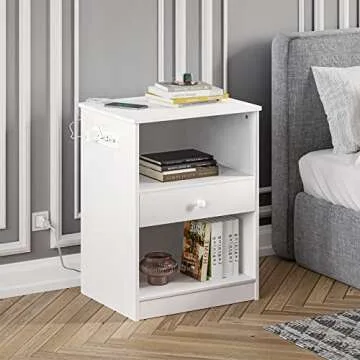Show more Introducing the EPHEX Set of 2 Nightstands, the perfect blend of style, functionality, and convenience for your bedroom or living space. Crafted from durable MDF board, these nightstands not only offer a sturdy structure but also a sleek modern look that complements any decor. Each unit features a spacious drawer that slides smoothly and two open storage cubbies for easy access to your essentials. Plus, with integrated USB ports and standard plug outlets, you’ll never run out of charging options for your devices!