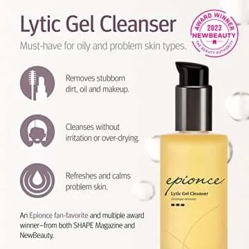Show more If you're seeking a skincare solution that puts cleanliness at its core while ensuring gentleness on your skin, look no further than the Lytic Gel Cleanser by Epionce. Designed specifically for oily and problem skin types, this cleanser effectively removes dirt, excess oil, and makeup without causing over-drying or irritation. With each use, you’ll experience a sensation of refreshment and rejuvenation as the product works to dissolve impurities from your skin, leaving it feeling clean yet hydrated.