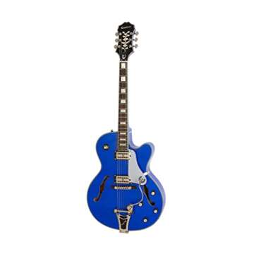 The Epiphone Emperor Swingster Hollowbody in stunning Delta Blue Metallic, is a dream come true for musicians seeking the perfect blend of vintage aesthetics and modern functionality. This exquisitely crafted guitar features a large semi-hollow body that not only provides incredible resonance but also produces a unique tone that is rich and full-bodied. With its striking finish and elegant design elements, the Swingster is as visually appealing as it is musically inspiring.