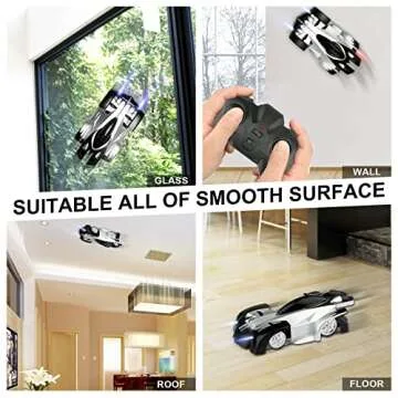 The EpochAir RC car can climb smooth walls, mirrors, windows, and ceilings. However, it is not suitable for textured walls.
