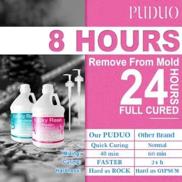 Show more Let your creativity flow with the PUDUO Epoxy Resin, specially designed for both seasoned and budding artists. This premium resin offers a crystal clear finish that beautifully showcases your projects, whether you're working with wood, jewelry, or other crafts. With a total of 64OZ of resin and hardener, you will get both a pump for easy dispensing and the assurance of high-quality results every time. What makes this resin stand out from others on the market is its fast curing capabilities. You can demold your creations as soon as 8 hours after pouring, and it fully cures within just 24 hours, maximizing your creative productivity.