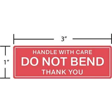 Show morePresenting the **EPS Handle with Care - Do Not Bend - Thank You Shipping Stickers**, the perfect solution for all your shipping needs! With a size of **1"x3"** and featuring a bright, bold design, these stickers are crafted to grab the attention of mail carriers and ensure your packages are handled with utmost care. Each roll contains **1000 stickers**, providing exceptional value and convenience for both personal and business use. The strong adhesive ensures they stick securely to most surfaces, making your shipping experience hassle-free.