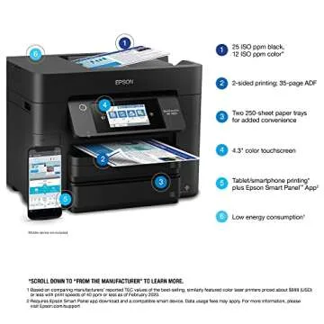 When evaluating multifunction printers, the Epson Workforce Pro WF-4833 stands out due to its unique features and exceptional reliability. Compared to other models, it offers higher printing speeds, a larger paper capacity, and user-friendly mobile printing options. Its advanced heat-free technology means less energy consumption and reduced maintenance, providing a longer lifespan and overall better value than many competitors in its class.