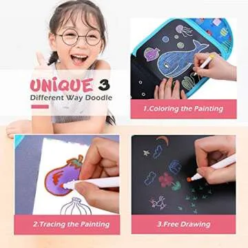Unlike other doodle books that may only provide basic coloring options, the Erasable Doodle Book excels with its unique triple functionality—coloring, tracing, and freehand drawing—making it a superior choice for children's creative exploration. The built-in pouch for storing markers and cleaning cloth adds convenience, ensuring that all essential tools are safely stored and easily accessible. Best of all, contrary to many travel art kits on the market, this product is designed for easy cleanup to encourage kids to unleash their imagination without the stress of making a mess!