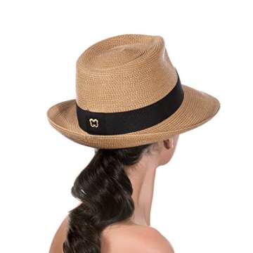 Show moreIntroducing the Eric Javits Women's Squishee Classic Fedora – an exquisite blend of style and functionality. Perfectly designed for the modern woman who appreciates elegance and protection, this fedora is crafted from a flexible, lightweight squishee straw that effortlessly forms into a chic silhouette. The classic design is enhanced with a tasteful grosgrain ribbon band, adding a touch of sophistication while remaining versatile enough for any occasion. The fedora's high-quality construction ensures durability and long-lasting wear, making it a staple accessory destined to complement any wardrobe.