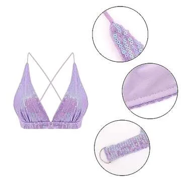 Erinaco Women's Sparkly Sequin Crop Top V-Neck Low-Cut Tube Top Backless Tank Tops Spaghetti Strap Camisole Bright Purple