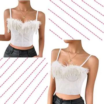 Erinaco Women Sexy Faux Fur Beaded Tassel Crop Top Spaghetti Strap V Neck Low-Cut Tank Top Sleeveless Camisole
