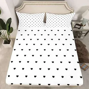 The Erosebridal White Black Bed Sheets Cute Heart Pattern Sheet Set redefines comfort and charm for your bedroom. This twin-size bedding set includes a fitted sheet measuring 39"x75"x16", a flat sheet of 96"x66", and a cozy pillowcase of 20"x30". Crafted from premium microfiber material, each piece is woven using an intricate post-grinding process ensuring that it is ultra-soft, breathable, and remarkably comfortable. You'll find these sheets...