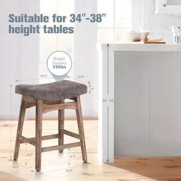 Show more Introducing the Erste!Bravo Solid Wood Bar Stools Set of 3, your perfect companion for any kitchen or dining experience. Crafted with premium quality materials, this set of barstools features a soft, breathable fabric that ensures a comfortable seating experience while adding a touch of elegance to your home decor. The uniquely designed padded saddle seat, measuring 19.7" x 12.6", is 3 inches thick and perfectly contoured to fit your body shape, providing you the support you need while enjoying long hours of conversation or meals at your kitchen counter. Built with a robust solid wood A-frame design and square legs, these stools can confidently support up to 330 pounds, making them a reliable addition to your space.