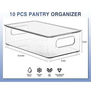 Show more Introducing the ultimate solution for a clutter-free kitchen and refrigerator with the ESARORA Set of 10 Fridge Organizer Bins. These thoughtfully crafted bins are the perfect addition to your home, designed to maximize space and enhance the organization of your pantry and fridge. Each bin measures approximately 10.3” L × 6” W × 3” H, providing ample space for your fruits, vegetables, canned goods, and much more. Their clear design allows you to see the contents at a glance, ensuring your items are always easy to locate.